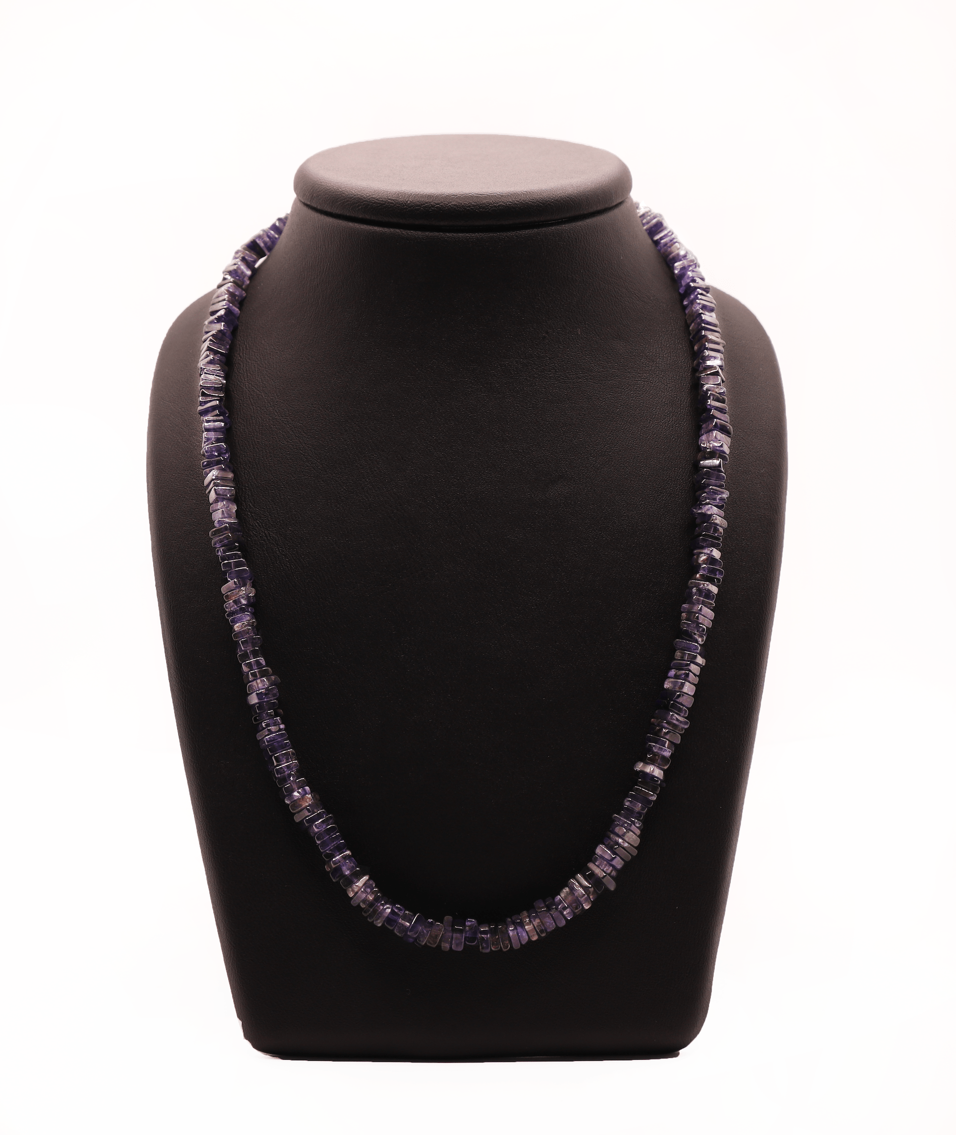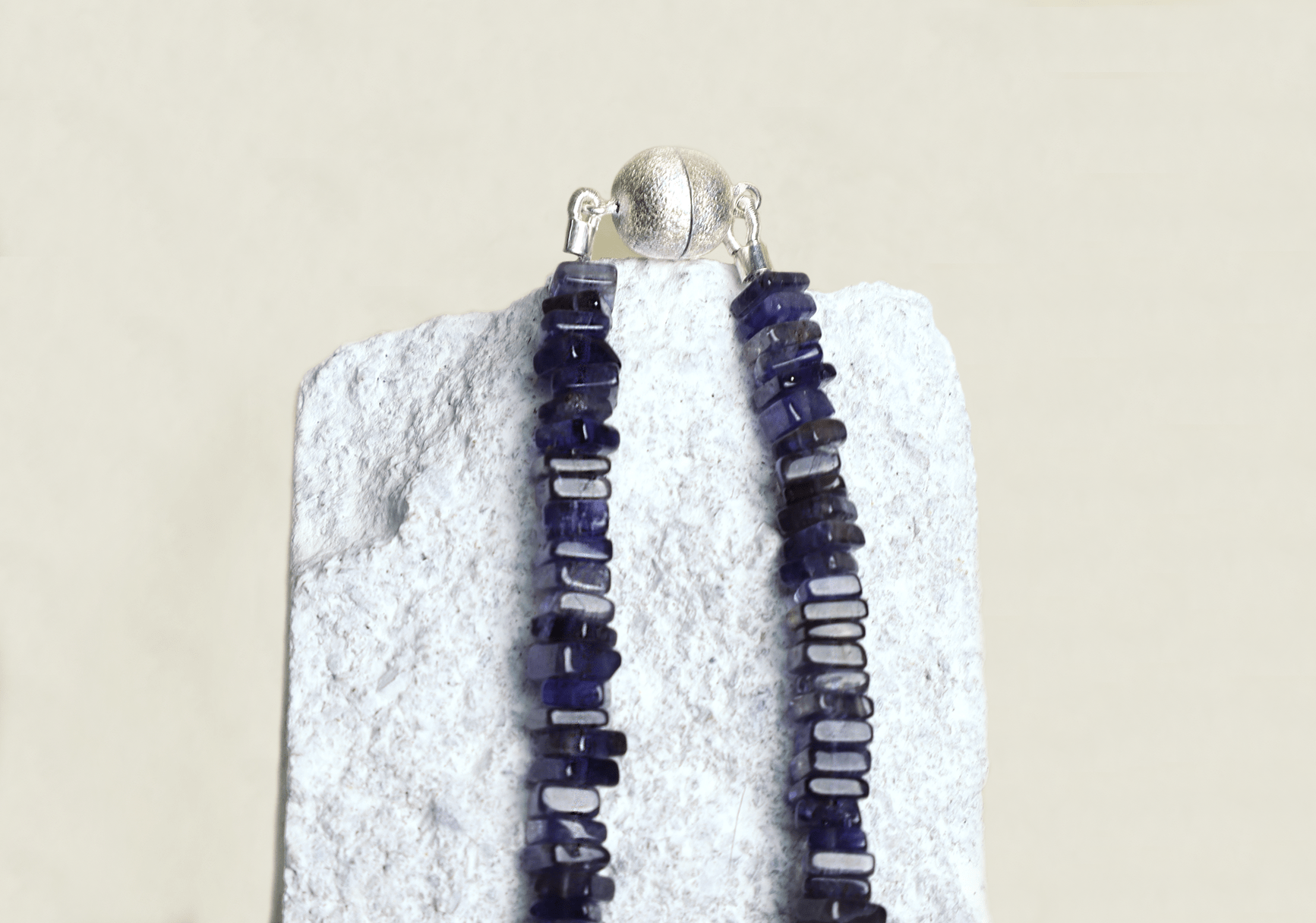 Halsband med iolit (även kallad för vattensafir) och ett magnetlås i silver 925. Iolit är en sten som skiftar i färg och kan upplevas som mörkblå, lila och svart beroende på olika ljusförhållanden.